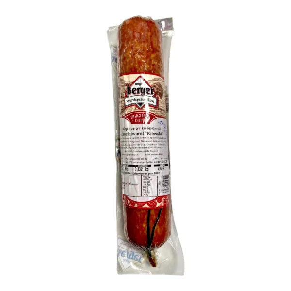 Składniki: wieprzowina 52%, boczek, woda, 4% skrobia ziemniaczana, sól, czosnek, cebula, przyprawy, ekstrakt przyprawowy, przeciwutleniacz: E301, barwnik: E120, wzmacniacz smaku: E621, substancja konserwująca: E250; regulatory kwasowości: E262, E331; stabilizatory: E450, E451; zagęszczacz: E412. Osłonka kiełbasy nie jest jadalna. Najlepiej spożyć przed: data i numer partii podane na opakowaniu. Przechowywać do +7°C.